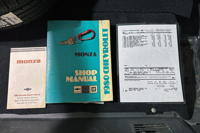 The Monza is accompanied by the original owner’s manual, factory service manual, and a copy of the original vehicle invoice from the General Motors Media Archive. New parts not yet installed include door trim seals and window felt, as well as tail lamps with amber turn signals. A pair of black bucket seats from a Mercedes SLK are sitting in the car, not bolted down.