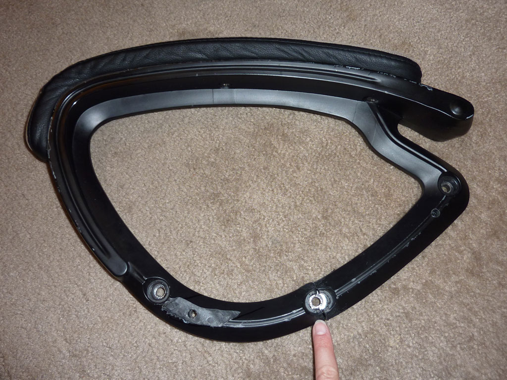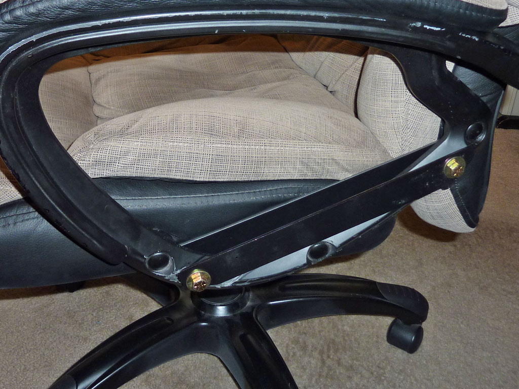The plastic arm on my computer chair developed a serious crack after a few years of regular use. I came up with a functional (but not beautiful) solution to brace the damaged arm. I bought a 1 1/4″ wide steel bar from Home Depot along with some with Grade 8 bolts. I used a metal cutting wheel on my Dremel tool to cut the bar into two sections and rounded the corners to match the contours of the chair arm. I used a sanding wheel to create a flat section on the plastic arm, and drilled some new holes through the arm to attach the bolts. Much cheaper than the cost of replacing the whole chair!