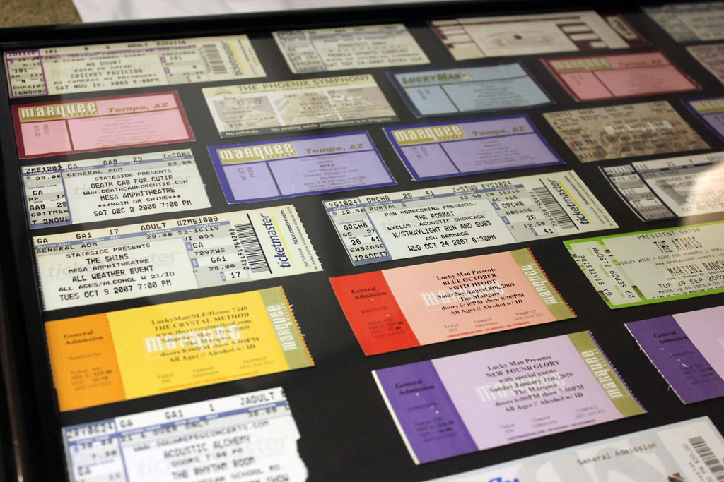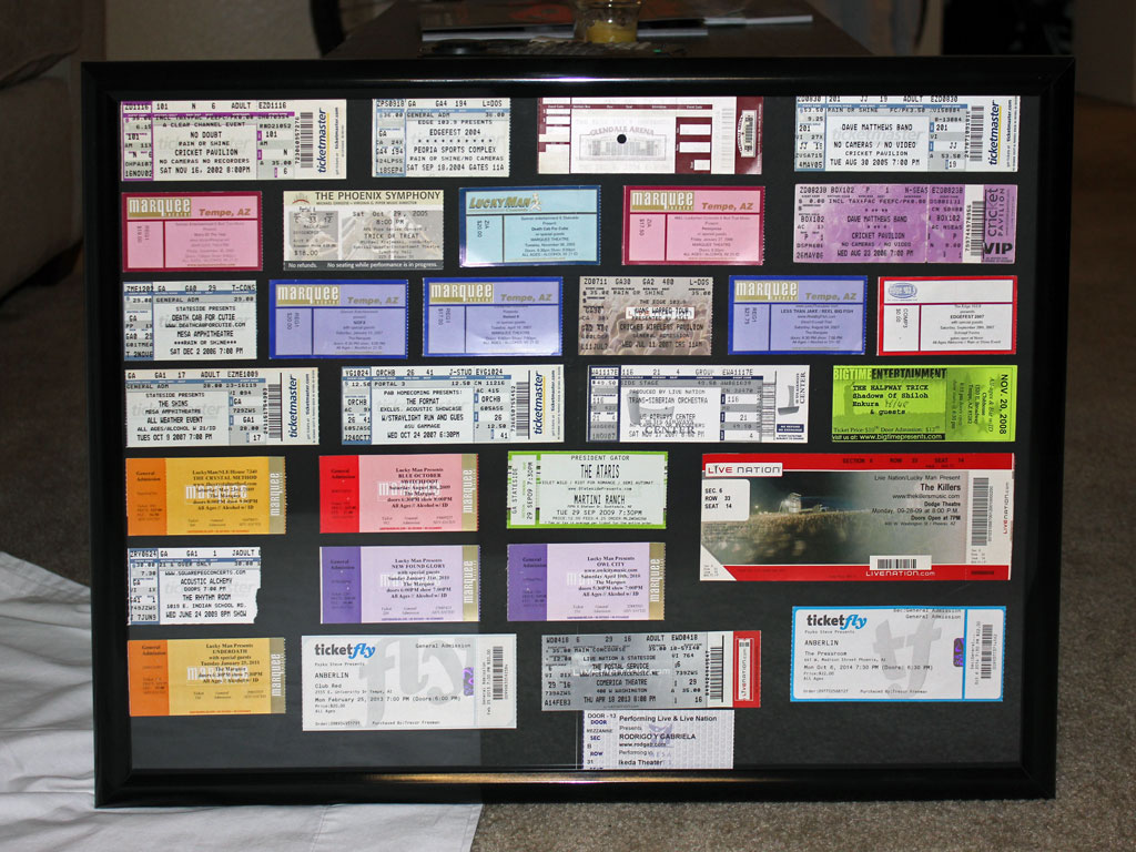 This is a 24″ x 18″ poster frame showcasing ticket stubs from concerts I have attended. The background is black construction paper and the tickets are mounted using 3M Photo Splits adhesive mount squares (commonly used in scrapbooks and photo albums). They are behind a thin sheet of plastic (instead of glass like in a nicer quality frame). I am already out of room and need to make a second one.