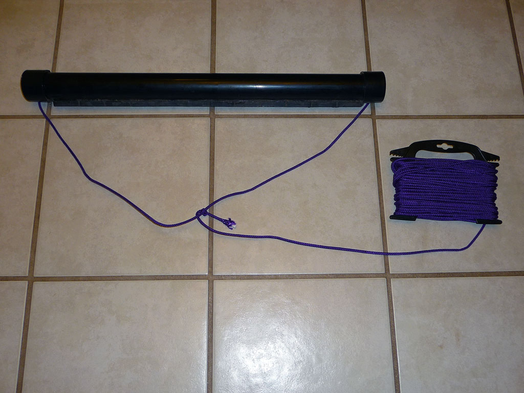 This simple device is built from a section of black PVC pipe with end caps, a length of rope, and a dozen strong magnets epoxied to the pipe in a straight line. It is excellent at picking up iron filings, nails, bottle caps, and other metallic objects when dragged across the ground.