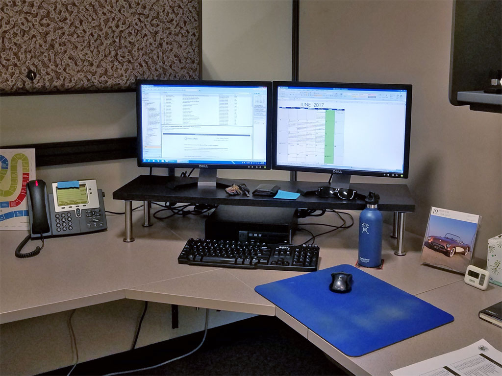 My desk at work has two 22″ Dell monitors that needed to be elevated to eye level. I purchased an EKBY Jarpen shelf from IKEA and shortened it from 46″ to 40″ using a circular saw. This shelf is 11″ wide (deep) which could accommodate the stands for the monitors. I did not finish the cut edge (left side) as it is not visible to me when seated. The 4.5-inch tall feet allowed enough clearance for the computer to fit neatly underneath the shelf.