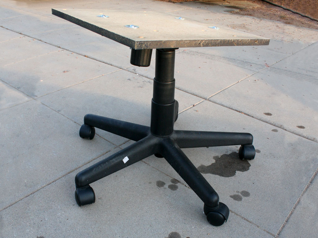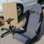When someone threw away a racing seat at the curb in my neighborhood, I thought about how neat it would be to make it into an executive-style office chair at a fraction of the cost of a real one. I purchased a beat-up office chair for $5 dollars at GoodWill and kept the rolling base. Then I mounted a piece of scrap wood to the base using 3-inch carriage bolts. The seat had four threaded holes which mounted nicely to the wood. It’s not glamorous but as a low budget proof-of-concept, it works.