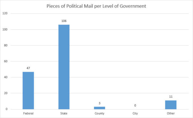 This chart shows the number of pieces of campaign mail I received, sorted by the level of government.