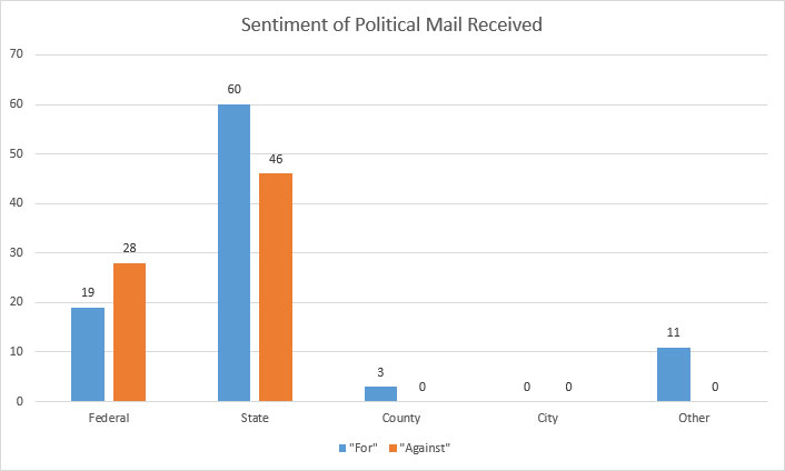- 106 pieces of mail were about State level elections, including State Senator and State Representative.