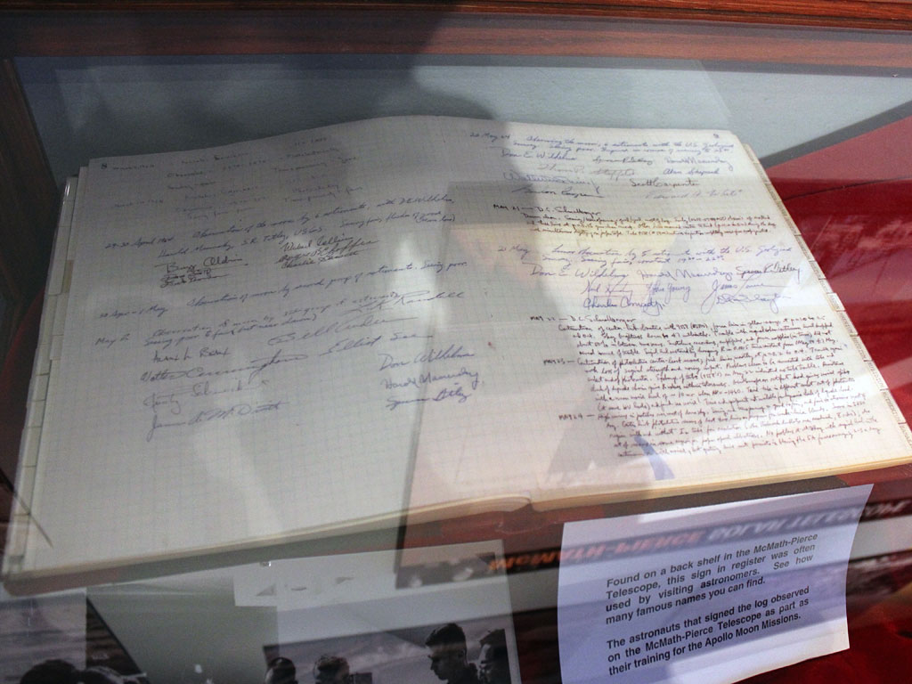 The McMath-Pierce Telescope also has a signed letter from President Kennedy and a log book with signatures from astronauts Buzz Aldrin, David Scott, Roger Chaffee, Charles Bassett, Alan Shepard, Scott Carpenter, and several others who visited the facility in April and May of 1964.