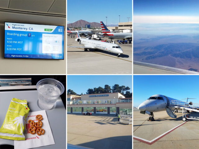 My flight aboard an American Airlines CRJ900 departed on time at 4:30 PM and arrived in Monterey around 6:30 PM. The Monterey airport is very small and has just 3 gates with no jet bridges. The afternoon sun was golden on the treetops as I walked down the stairs, across the tarmac, and into the airport.