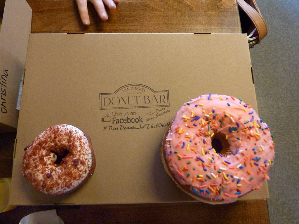 First on the list was Donut Bar in downtown San Diego’s business district. This small shop specializes in crazy, novelty donuts and baked goods. We each bought a small box of assorted donuts. I had a red velvet donut and a “Homer Simpson” donut that was easily 3x larger than a standard donut, with pink frosting and sprinkles. They had so many great flavors to choose from!